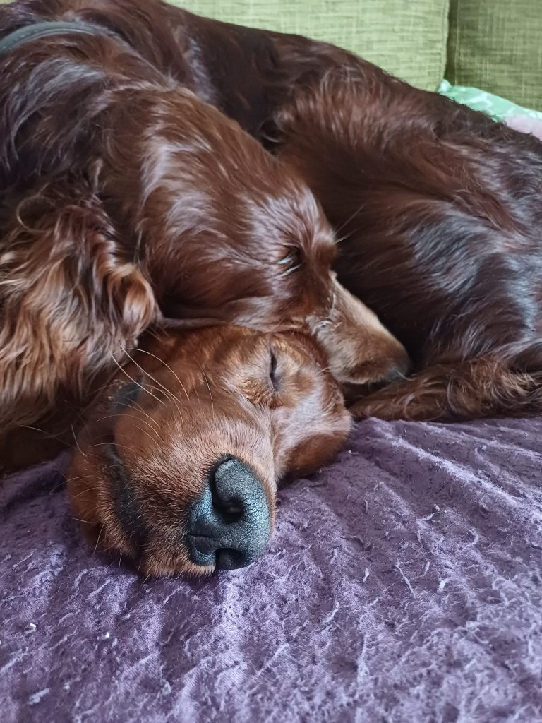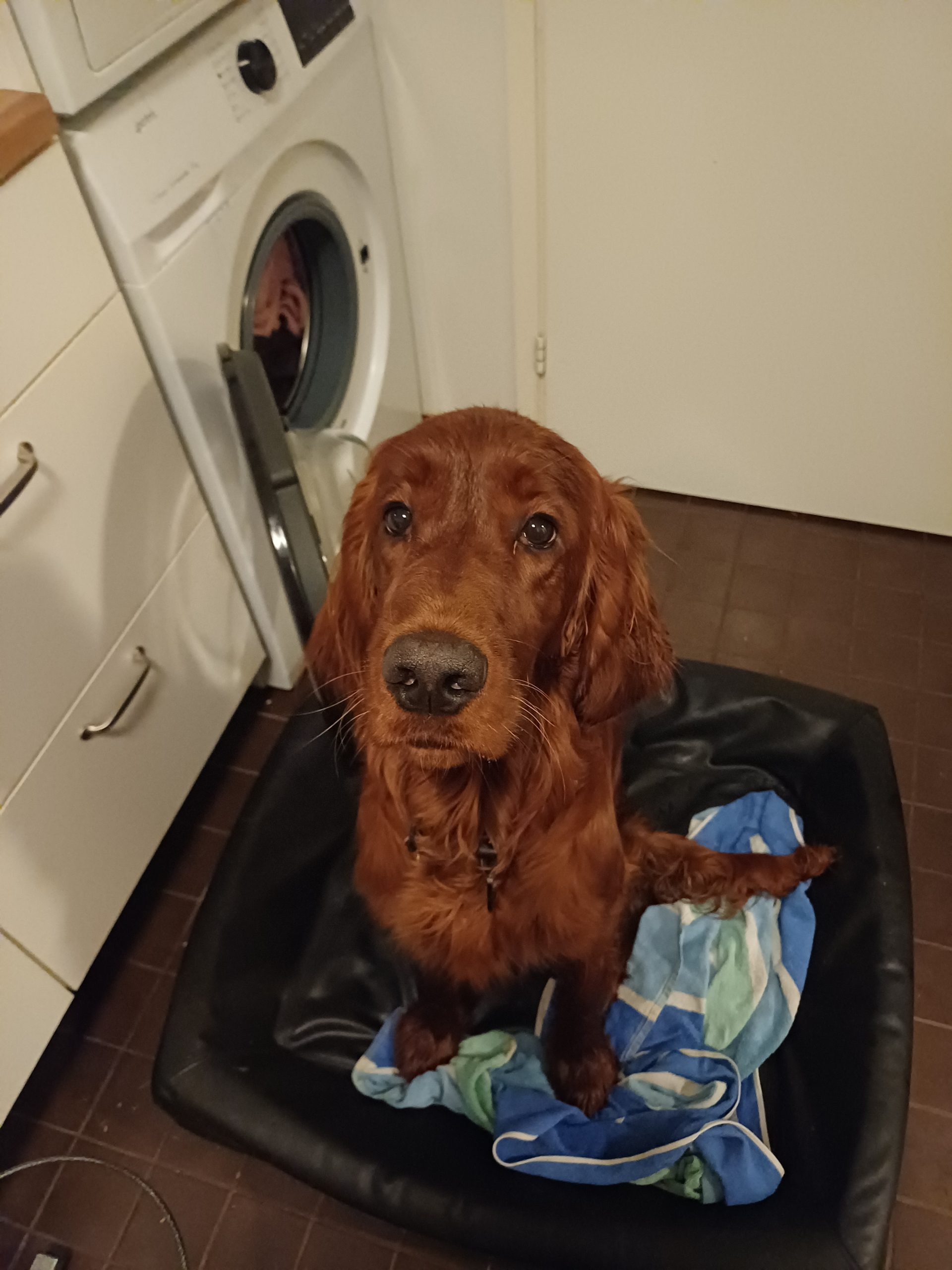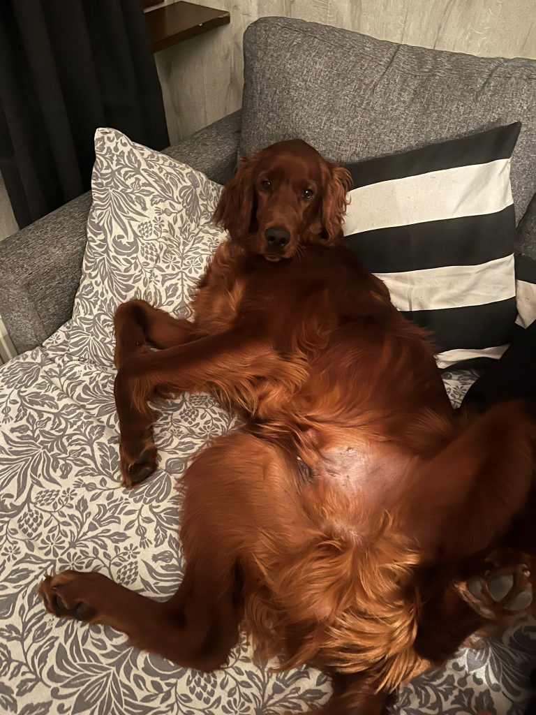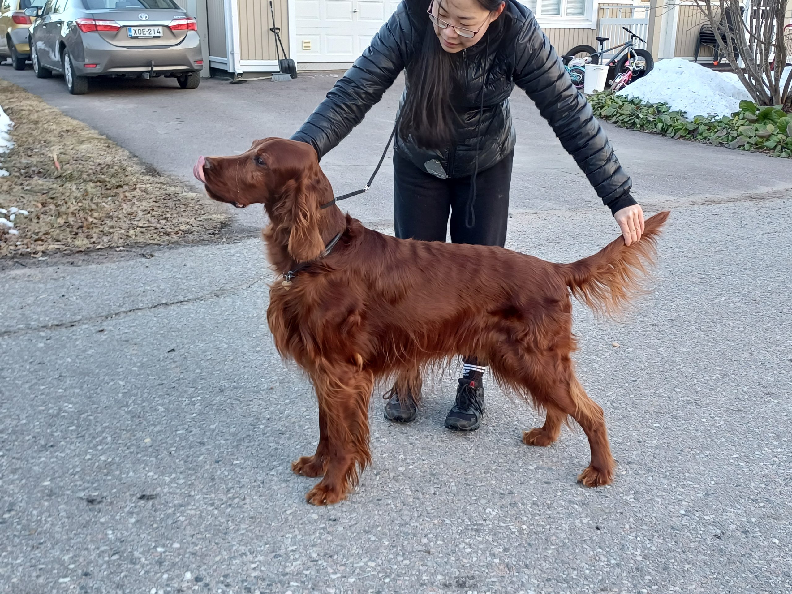Red Lovehunter`s Fairytale eli Maisa on kaikin puolin terve koira. Ei allergioita eikä suolistovaivaa. Lonkat koiralla on B/B, kyynärät 0. Maisa on perinnöllisesti Clad-terve ja silmiltään Pra rcd4 terve. Näyttelystä sertit kasassa ja luonne on avoin ja ystävällinen. Maisan omistaa Joonas ja sain mahtavan tilaisuuden tehdä hienolla tytöllä pentuja.